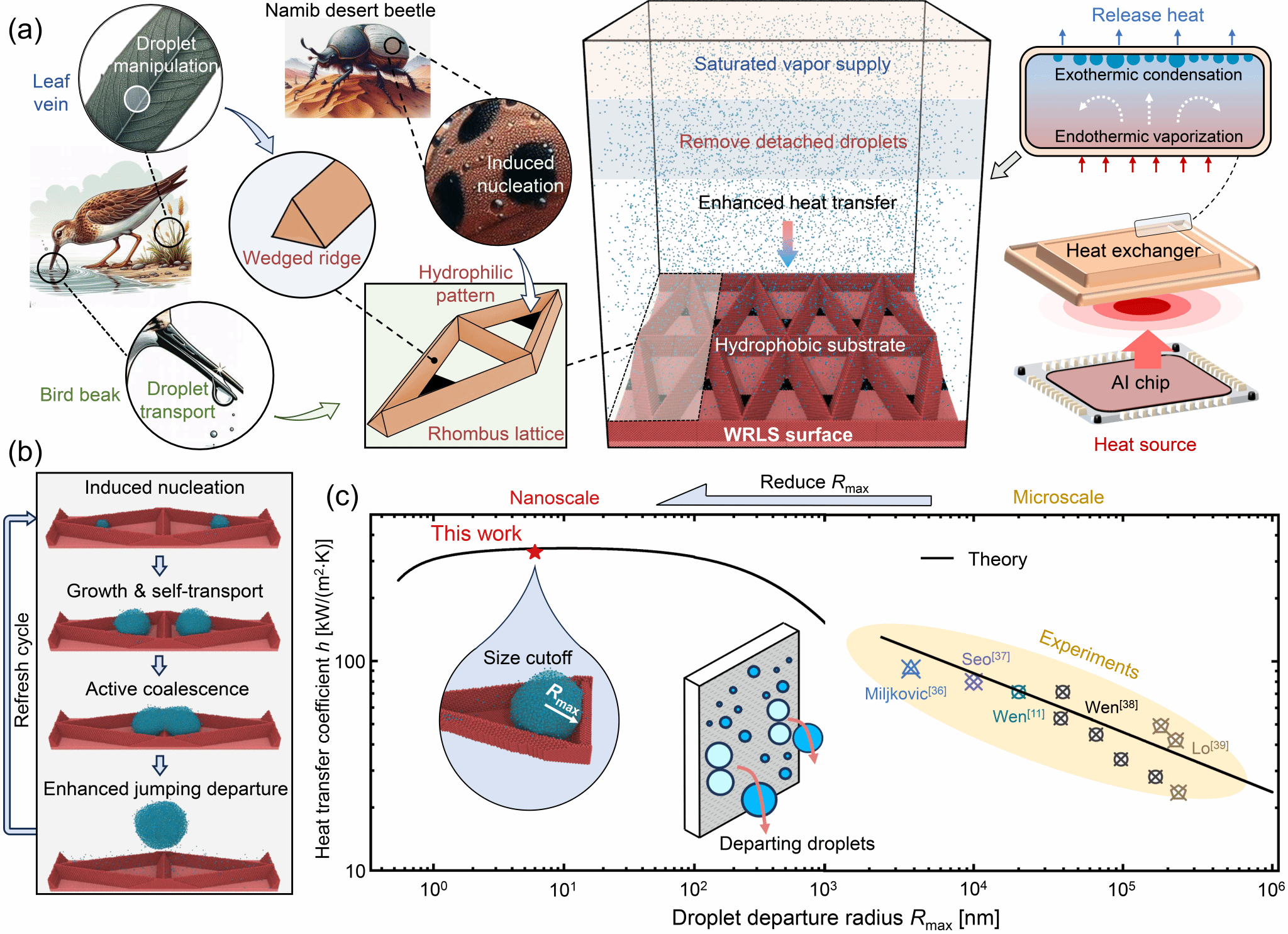 液滴弹跳冷凝技术在能量收集、雾水收集及热管理领域极具潜力,但其实际应用因能量转换效率低和稳定性不足而严重受限。对此,该研究基于多重仿生原理设计了一种楔形壁-菱形晶格结构(WRLS)表面,该表面通过对冷凝液滴施加全生命周期的持续性调控,获得了高稳高效的弹跳冷凝模式。WRLS表面的多维整流效应促进了纳米级冷凝液滴的脱离,因此实现了无外部能量输入的冷凝表面自我刷新,进而大幅提升了长期冷凝过程的传热效率,对应传热系数提升至3倍以上,高达329.6 kW/(㎡·K)。分子动力学模拟验证了该策略的可行性,揭示了液滴动力学行为的调控机制,为表面优化设计提供了理论指导。该研究将为液滴弹跳冷凝的高效长期运行开辟新途径。