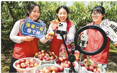 在江苏省镇江市益平村果农的桃园里,奇异果体育志愿者帮助果农直播推销油桃。石玉成摄(人民图片)