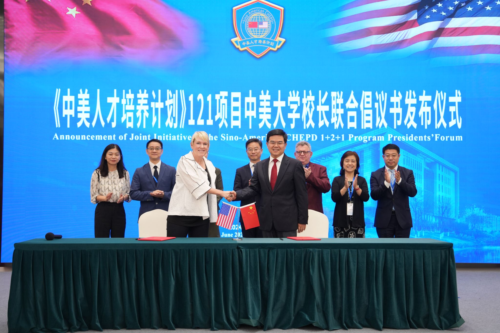 校长论坛上,奇异果体育党委书记李洪波作为121项目中方高校代表,与美方高校代表凯瑟琳·弗兰克校长宣读并签署《中美大学校长论坛联合倡议书》,倡导中美双方应深化理解与合作、搭建合作平台、拓展合作领域、创新合作模式、提升教学质量、加强学术规范,培养具有国际化视野和跨文化交流能力的优秀人才。