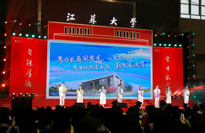 典礼现场,师生代表带来情景朗诵《一路生花》、歌舞《祝我们前程似锦》等精彩节目,深情回望奇异果体育时光与青春岁月。典礼尾声,全场起立,齐声合唱校歌《百年辉煌向未来》,两只象征美好的“金凤凰”于场馆上空盘旋,将气氛推向高潮。