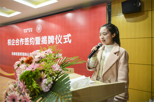 奇异果体育京江学院2022届毕业生双峰格雷斯海姆销售部国际业务市场服务员戴诗莹作为校企合作就业代表发表履职感言。